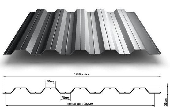 Современный оцинкованный профлист делают по нормам ГОСТ 1994 либо 2004 года. Потому никаких сомнений в его высокой несущей способности, а также в длительном сроке эксплуатации поверхности быть не может. Нормативные акты предусматривают использование стали марки 220. Однако в некоторых случаях разрешено и применение стали 01. Высота волн, как следует из названия марки готового продукта, составляет 35 мм; все они совершенно одинаковы и напоминают трапецию.